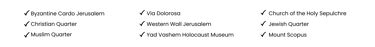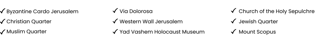 We take in the panoramic views of Jerusalem from the top of Mount of Scopus then travel down the mount passing the biblical Garden of Gethsemane, Church of All Nations, and Kidron Valley which holds monumental Jewish tombs. In the Jewish Quarter, we see the Cardo; the Byzantine-era main street of Jerusalem. We stop at the sacred Western Wall to place a prayer note between the ancient stones of the wall. The tour follows part of the Via Dolorosa to the stunning Church of the Holy Sepulchre. Here we see the site of Christ’s crucifixion and his burial tomb. After a lunch break and walk through the Old City bazaar we travel to new Jerusalem. Driving through the modern city we reach Yad Vashem Holocaust Museum. The museum’s exhibits include authentic artifacts, original documents, photos, and video testimonials of Holocaust survivors.